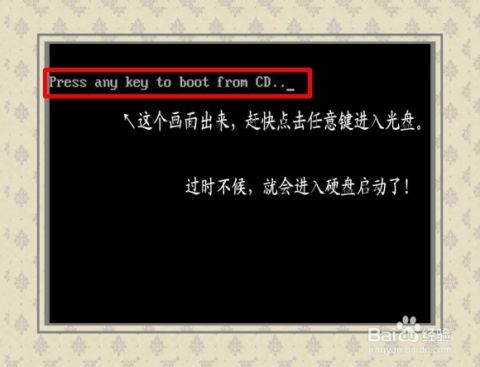 进入到以下界面,一定要点击一下键盘(任何键),否则系统会认为用户不要读光盘,就会自动转到读取硬盘数据了,很多人就在这个环节出错,听信全自动安装的告示,其实不然。
