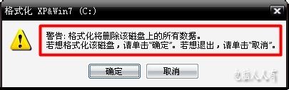 格式化磁盘分区的动作会将分区中所有的文件清除,所以点击格式化之后会有警示弹出。